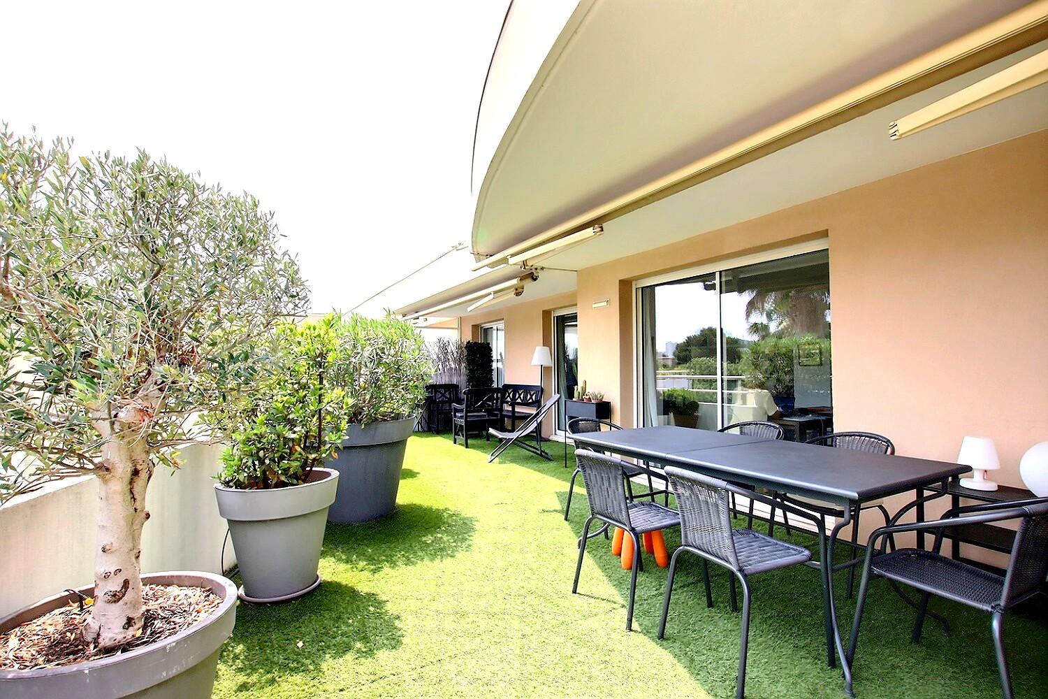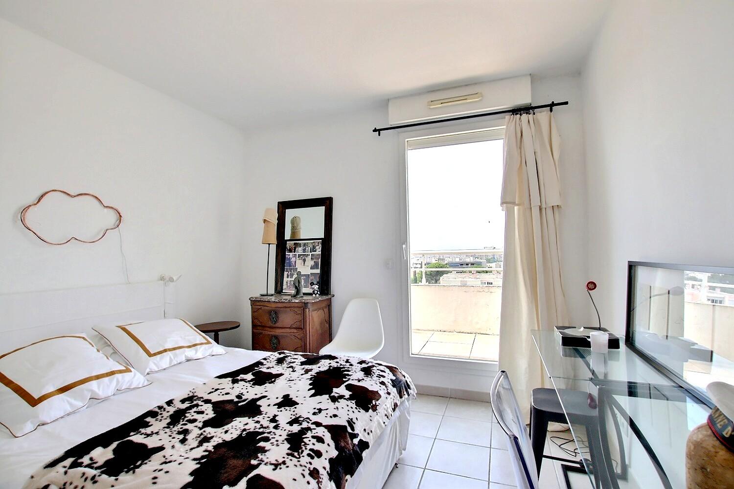 Sada immobilier, professionnel depuis 1977, vous propose : Dans une résidence de standing, au calme, un appartement situé au 4ème et dernier étage ascenseur, composé d'un séjour, d'une cuisine donnant sur une terrasse, d'une suite parentale avec salle de bains, d'un wc séparé, de deux chambres, d'une salle d'eau. Vue sur les collines de Saint Joseph. Belle prestation. Double vitrage, terrasse et balcon. Traversant.