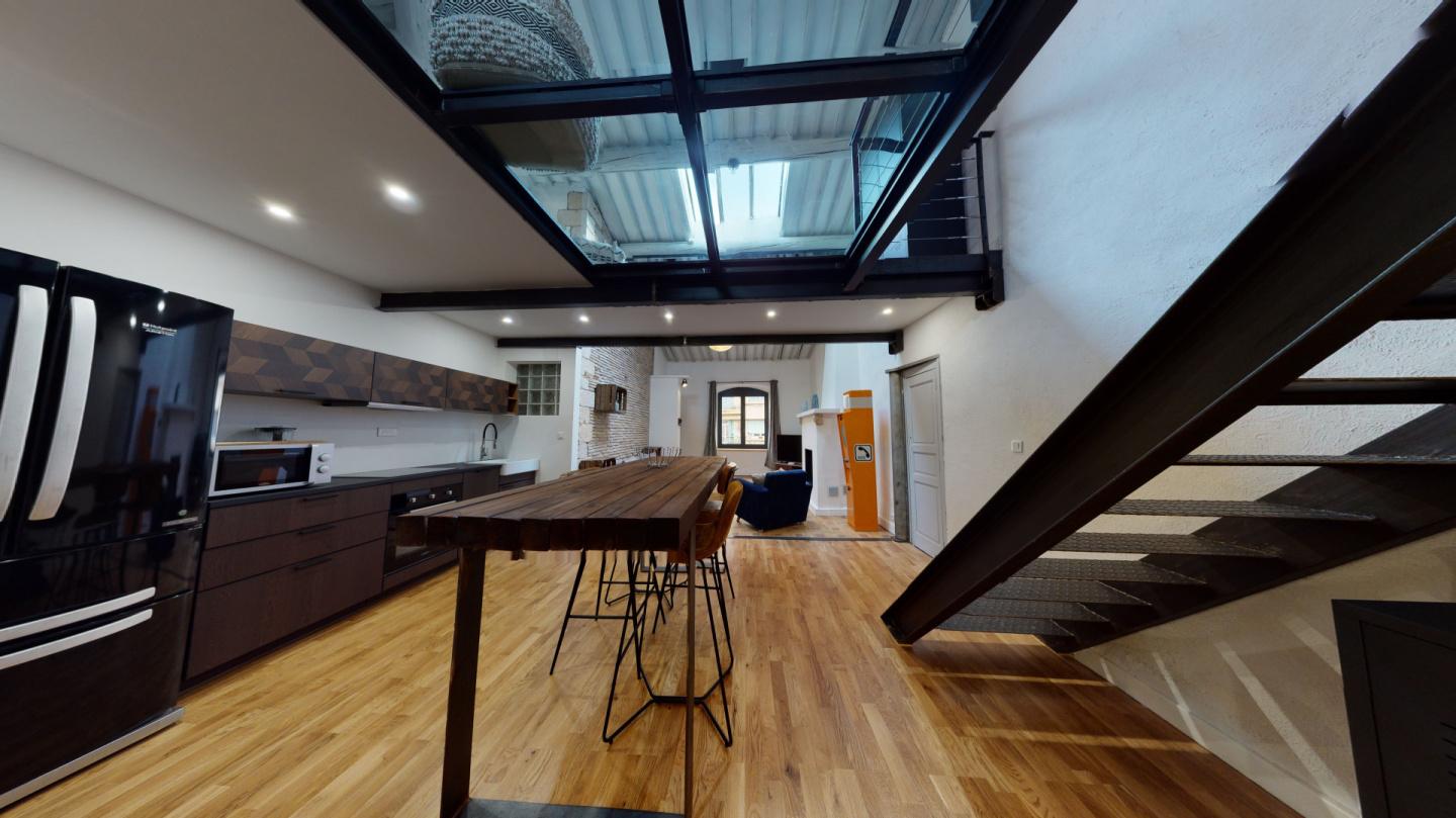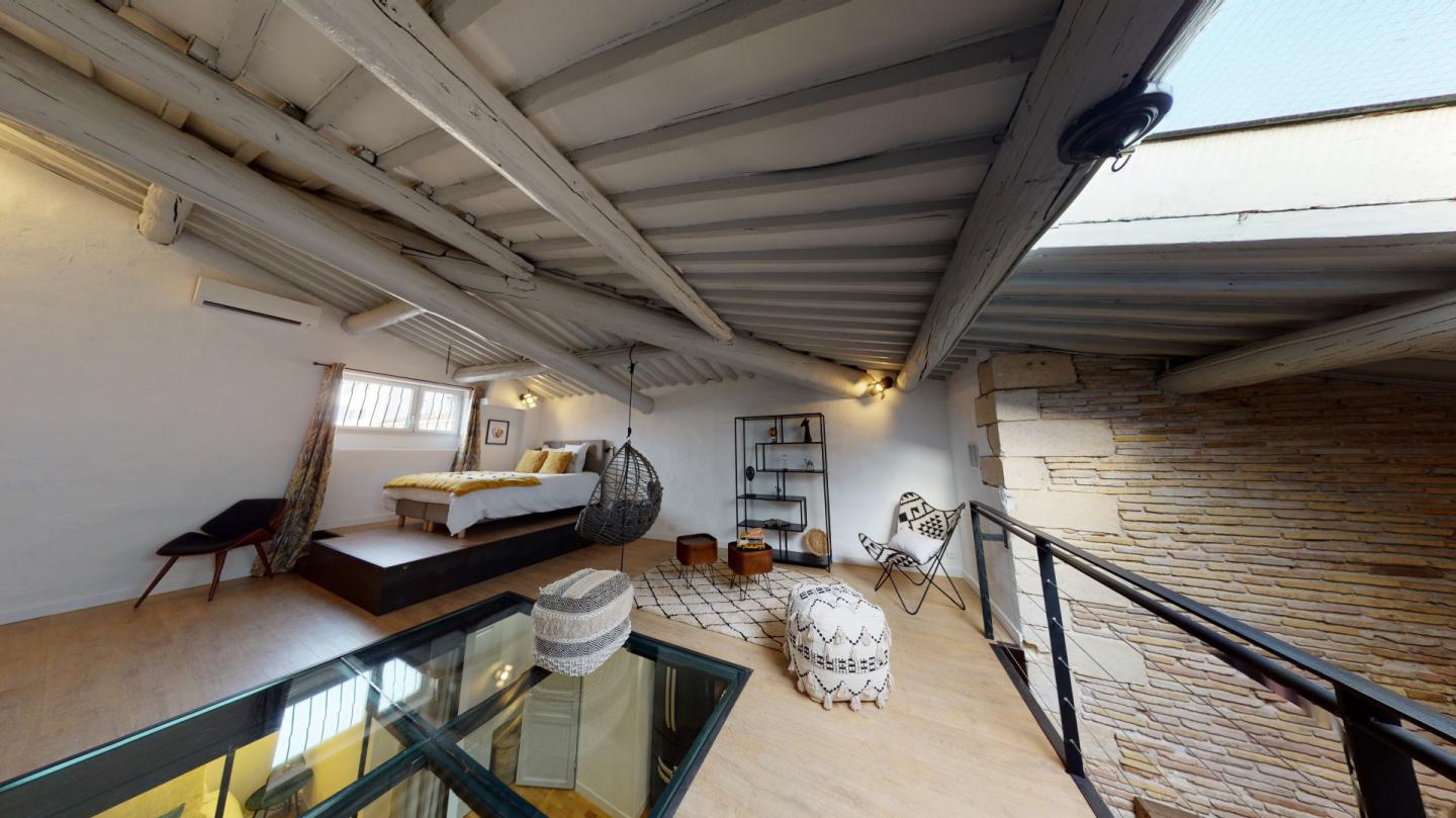 Dans un immeuble ancien situé au bas de la rue Neuve Ste Catherine, Loft en duplex avec énormément de cachet au 2ème et dernier étage sans ascenseur composé d une entrée sur la pièce à vivre avec belle hauteur sous plafond, espace cuisine équipée, une salle d eau et un wc, une chambre et en mezzanine une grande chambre ouverte.