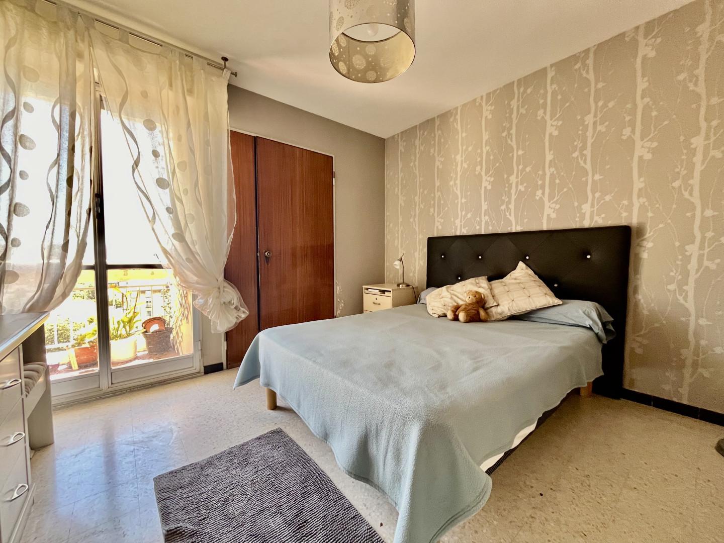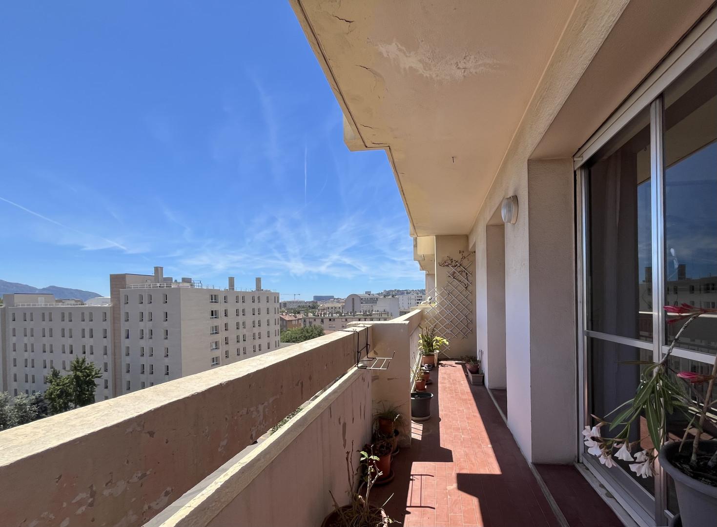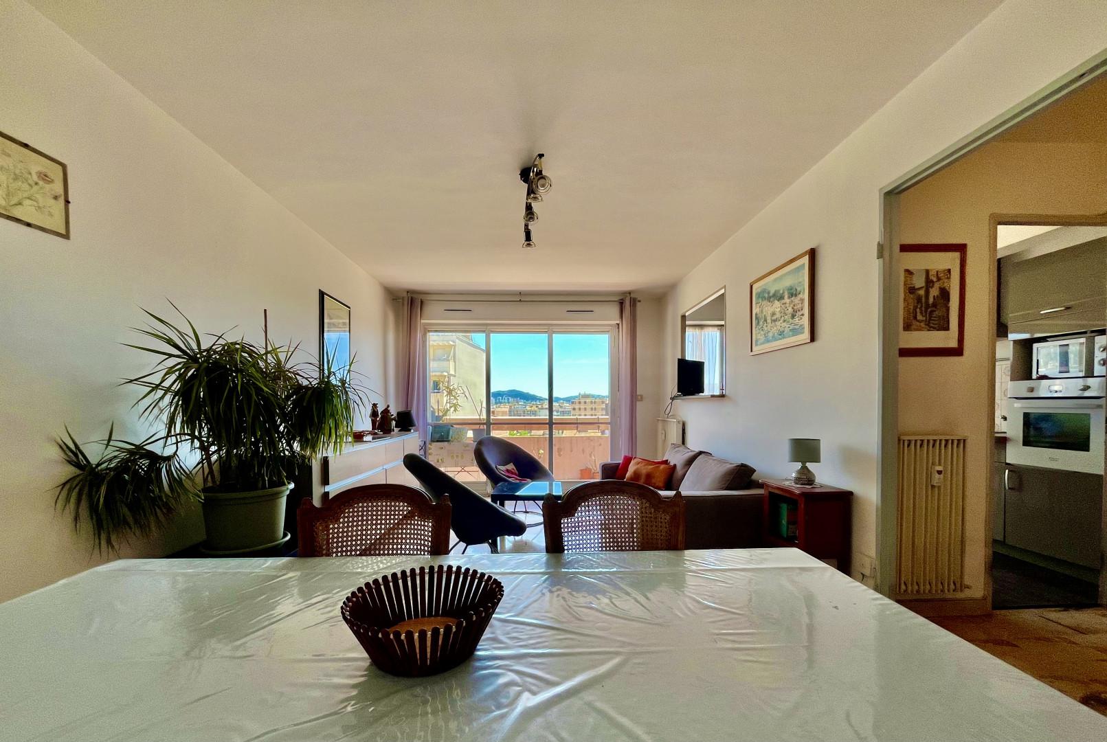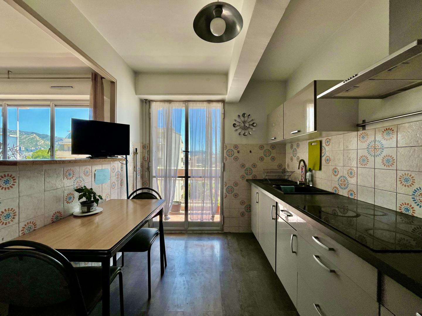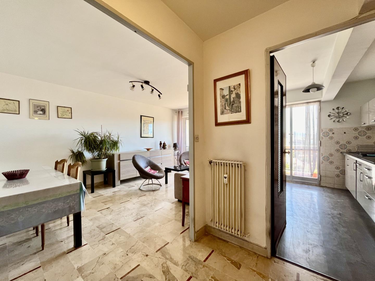 Dans un immeuble semi récent très bien entretenu, au début du Boulevard Mireille Lauze, T2 en bon état, au calme, exposition Sud et vue dégagée, 6ème étage avec ascenseur composé d une entrée desservant une pièce à vivre avec du marbre au sol donnant sur un grand balcon, cuisine séparée équipée, une chambre, une salle d eau, wc séparé, cave.