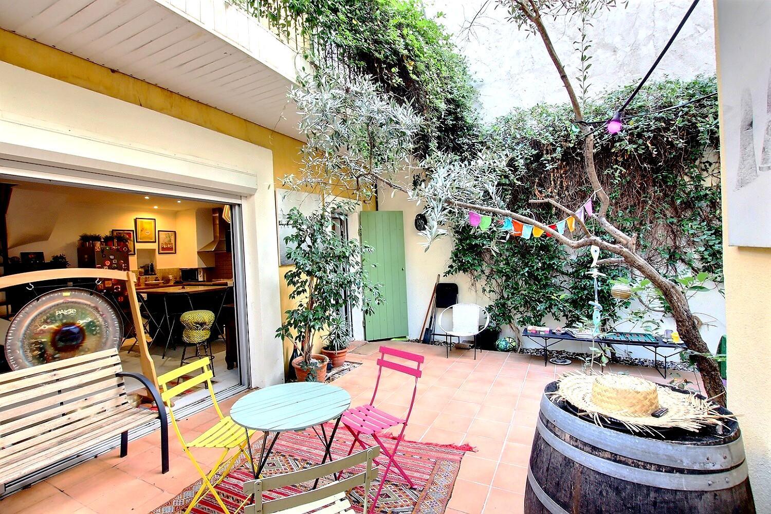 Maison de ville avec beaucoup de charme, en fond de cour, au calme absolu, composé au rez de chaussée de la pièce à vivre avec cuisine le tout donnant sur une belle terrasse de 40m² arborée et un studio avec sanitaire et mezzanine pour le couchage.